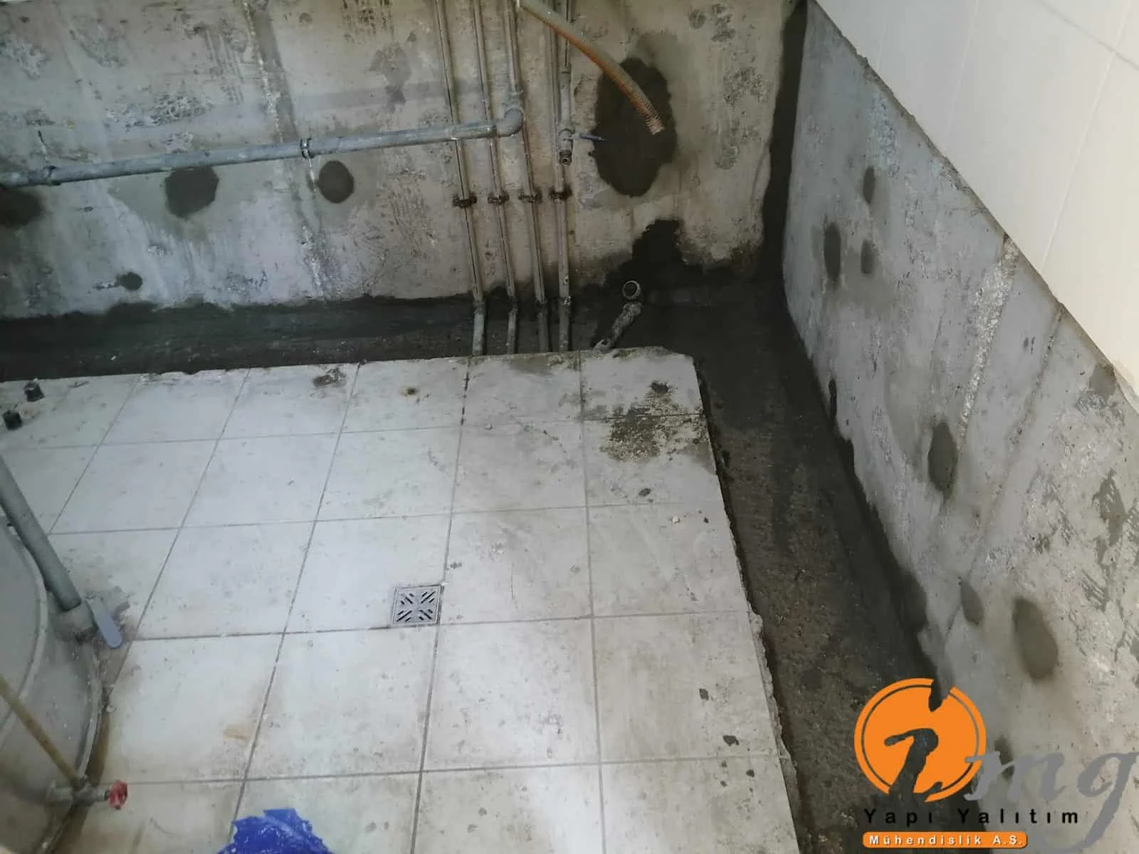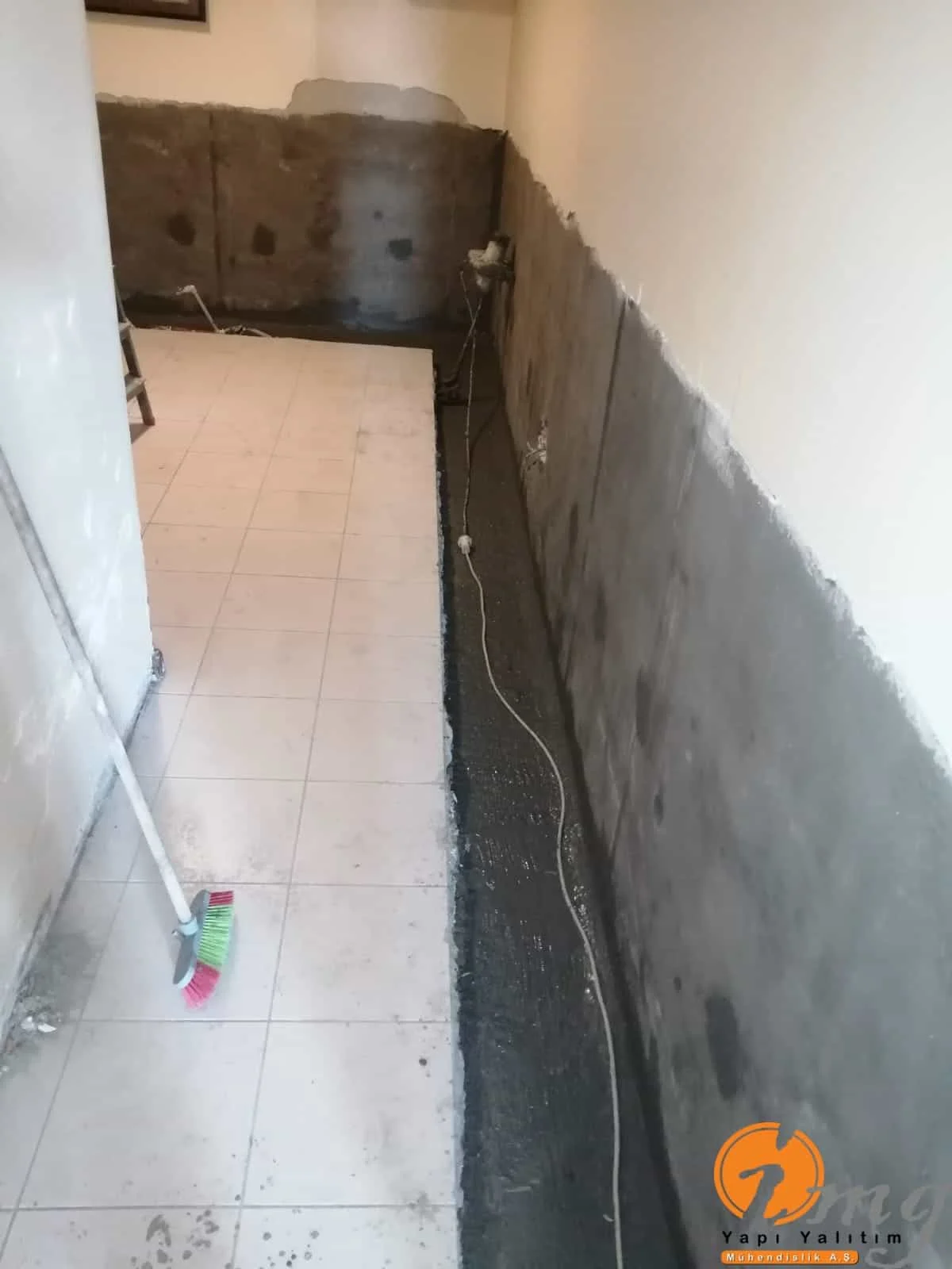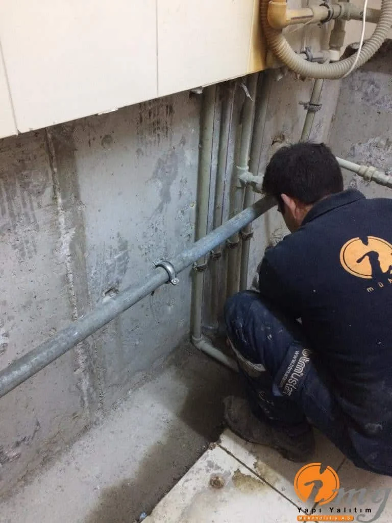 Öncelikle zemin kırıldı. Kılcal gelen çatlaklar için poliüretan enjeksiyon su yalıtımı yapılıp en son aşamada kristalize su yalıtım malzemesi ile uygulama sonlandırıldı.