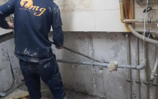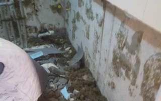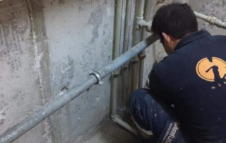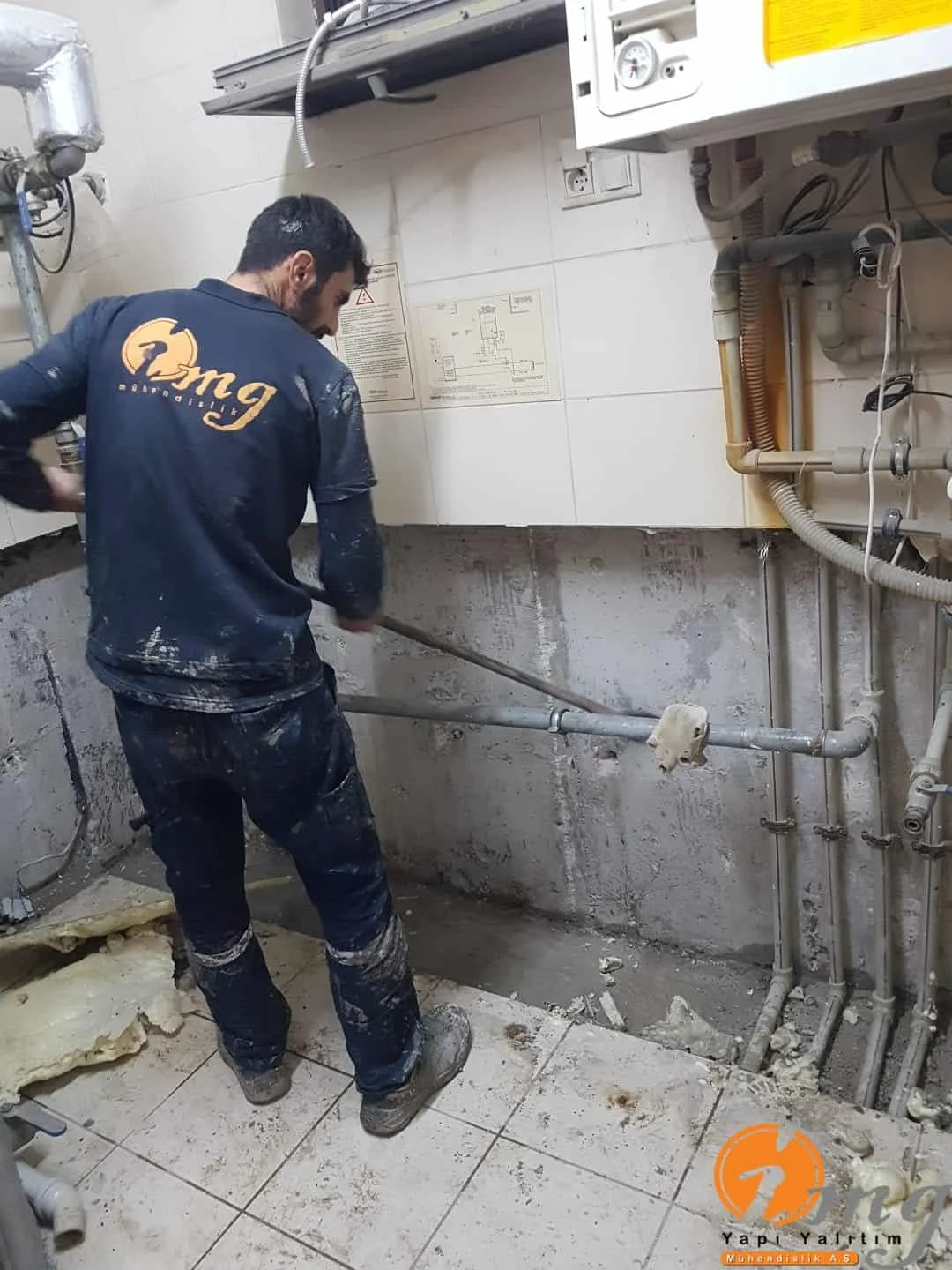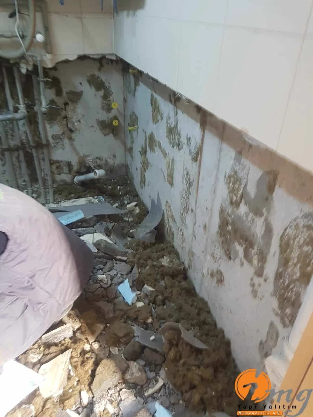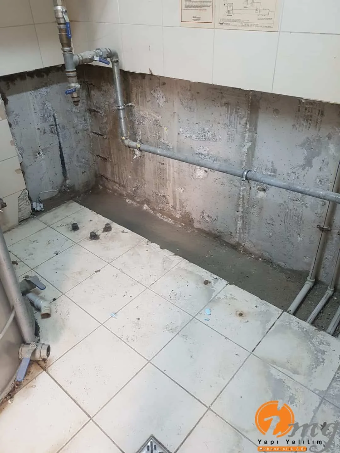Öncelikle zemin kırıldı. Kılcal gelen çatlaklar için poliüretan enjeksiyon su yalıtımı yapılıp en son aşamada kristalize su yalıtım malzemesi ile uygulama sonlandırıldı.