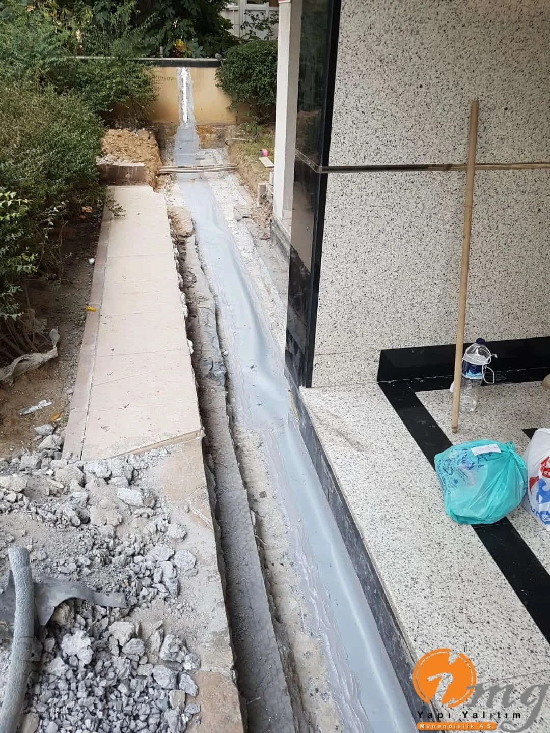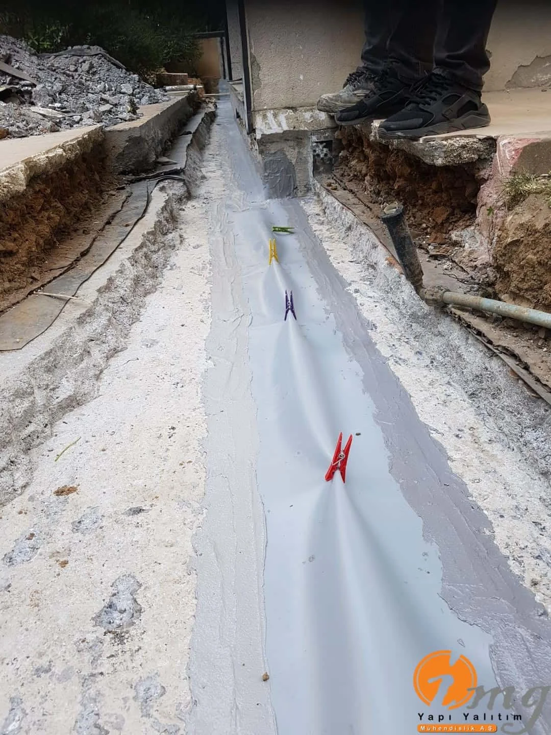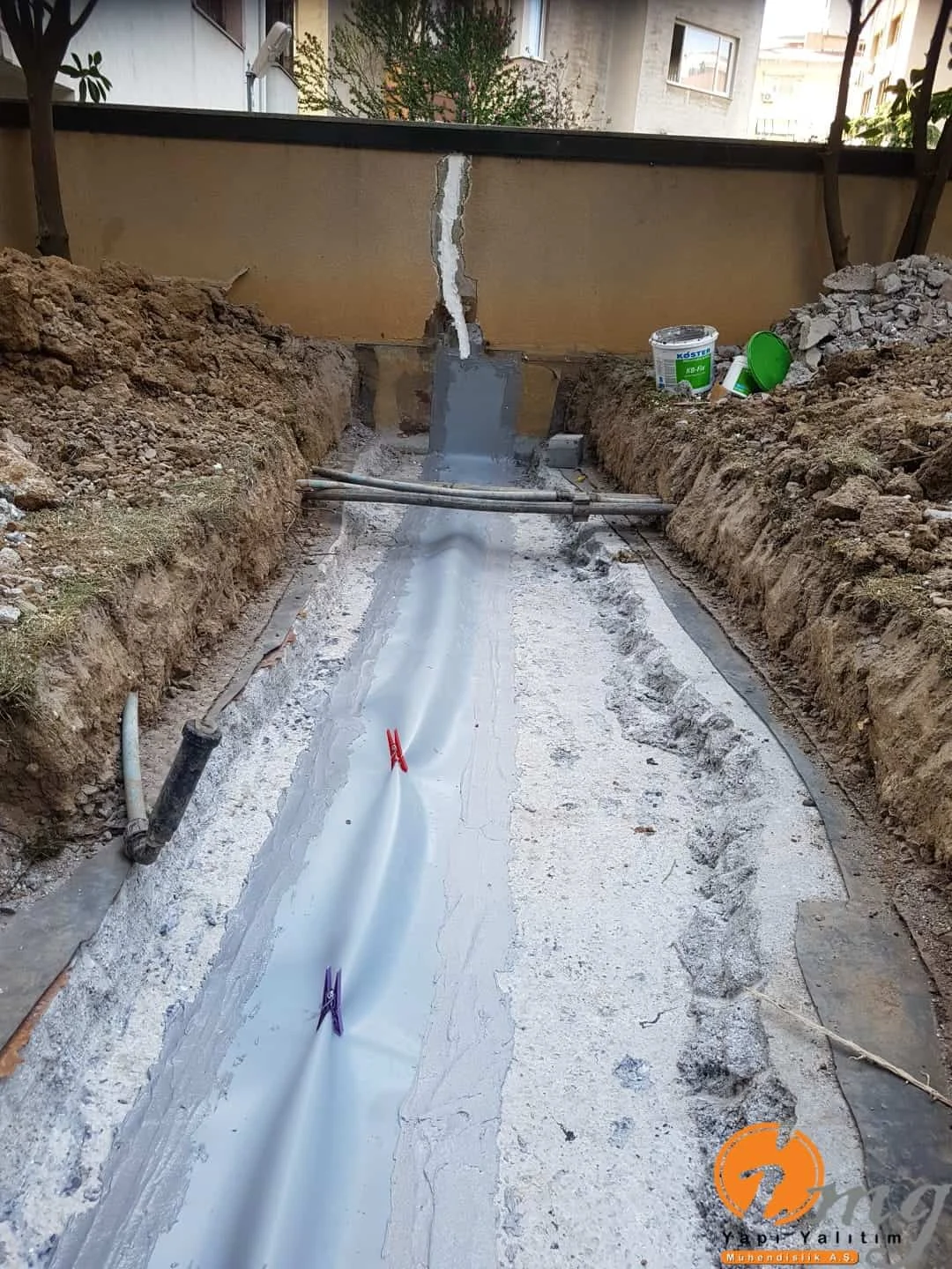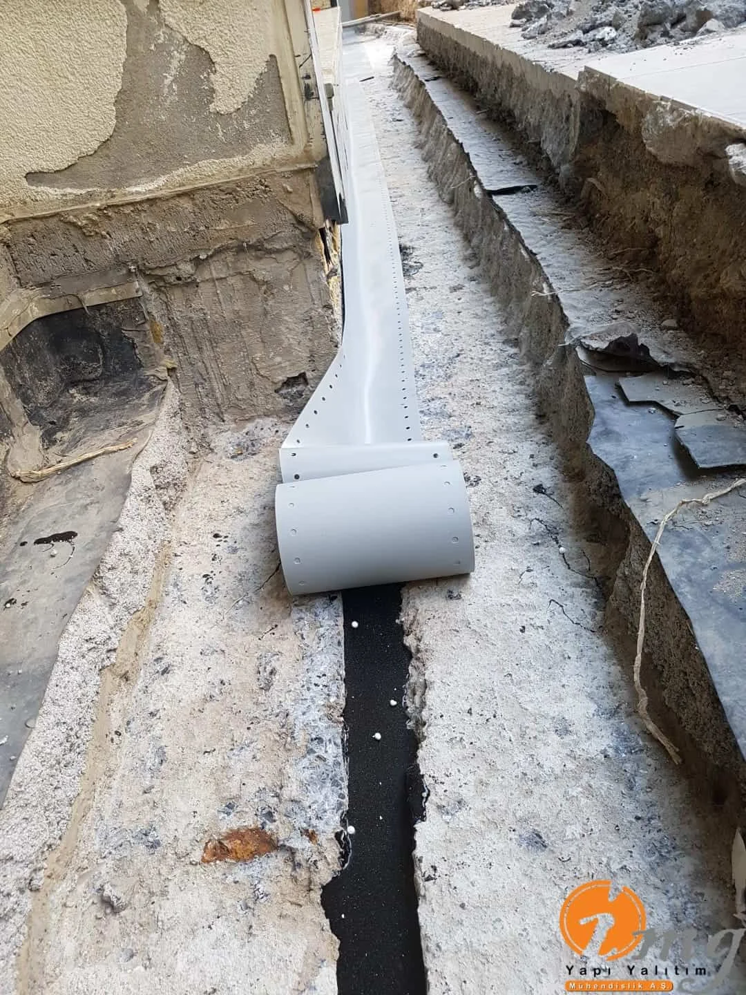 Farklı tipteki iki yapının birbirinden ayıran kısma dilatasyon diyoruz. Biz burda dilatasyon bandı-epoksi yapıştırma harcı ve sağlamlığı artırmak için sonrasında dökme mastik ile yalıtımı güçlendiriyoruz.
