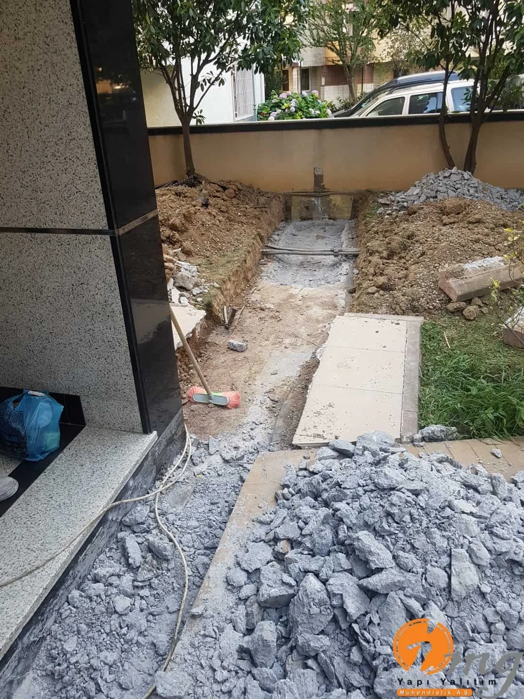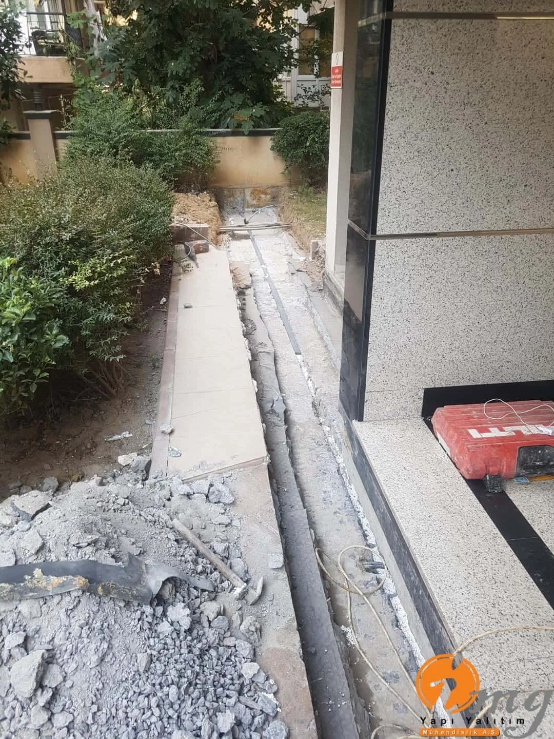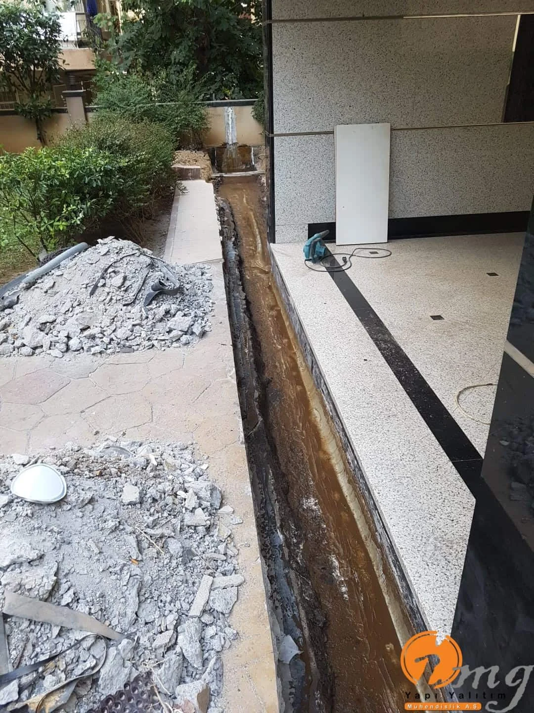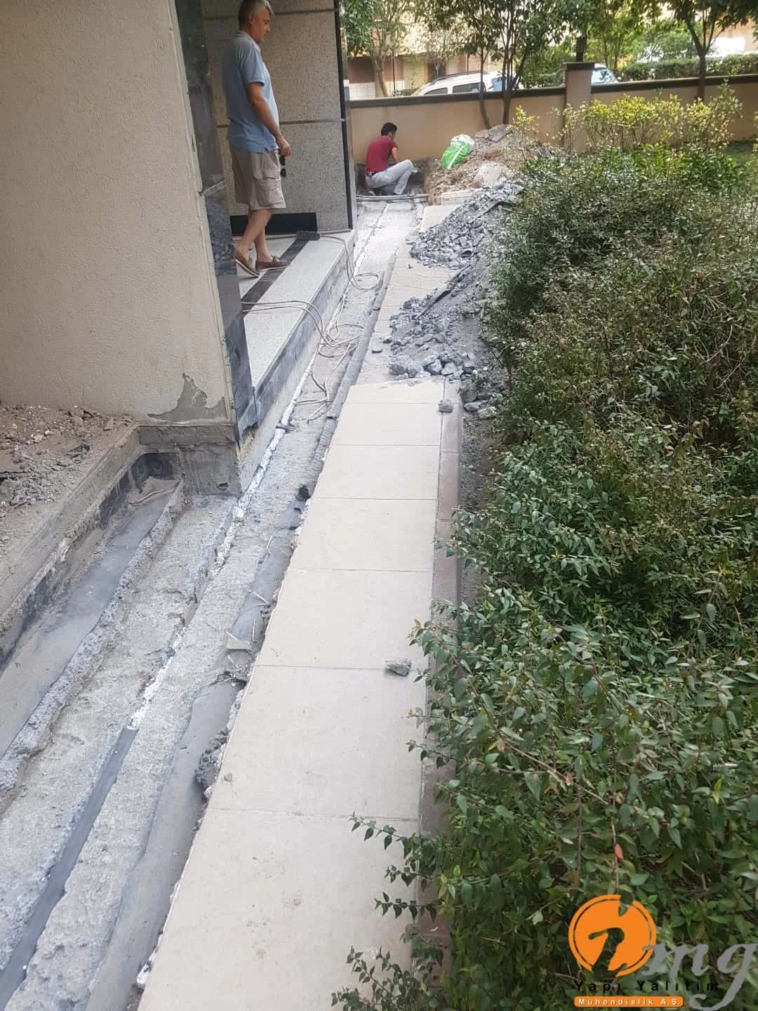 Farklı tipteki iki yapının birbirinden ayıran kısma dilatasyon diyoruz. Biz burda dilatasyon bandı-epoksi yapıştırma harcı ve sağlamlığı artırmak için sonrasında dökme mastik ile yalıtımı güçlendiriyoruz.