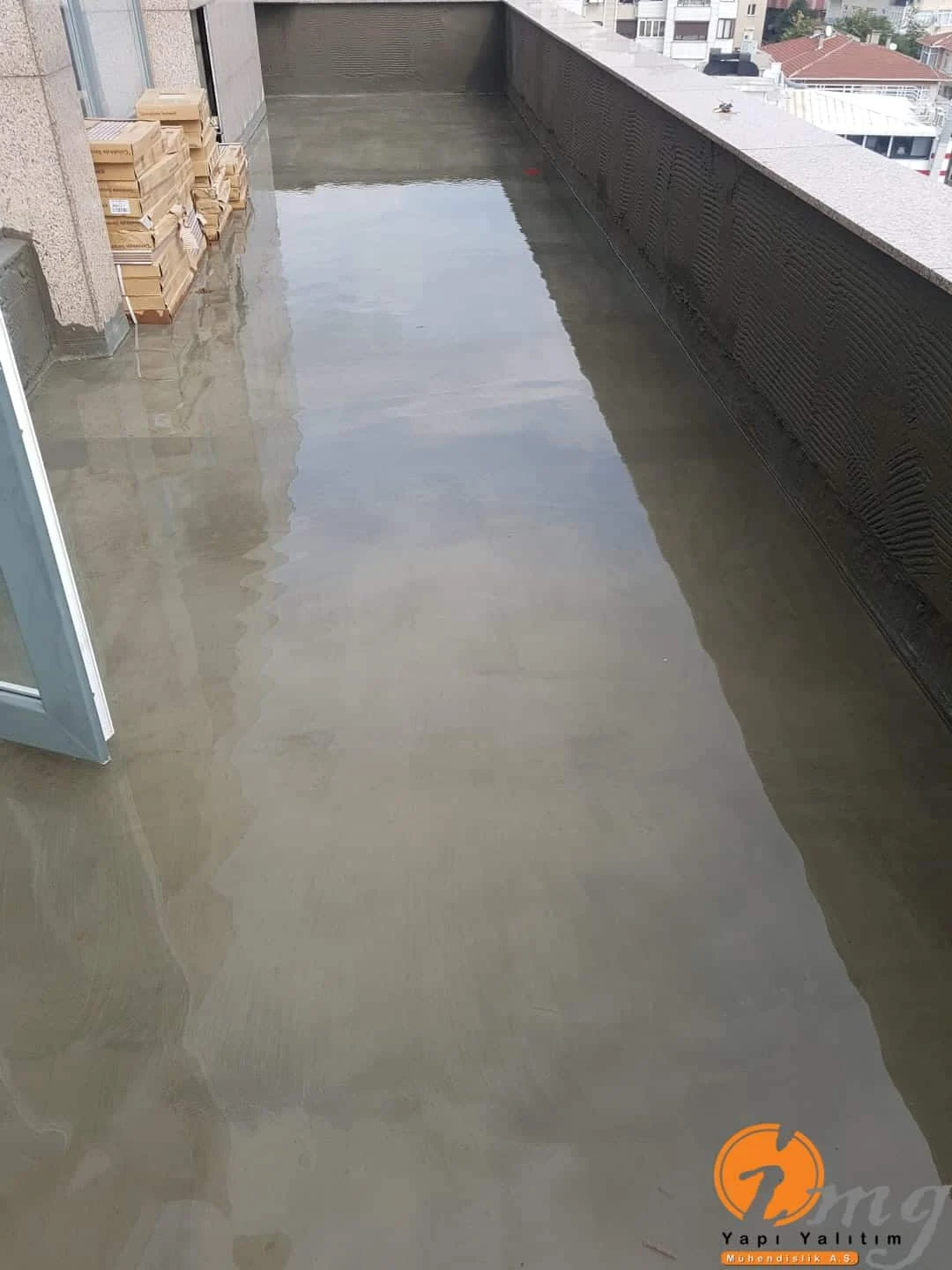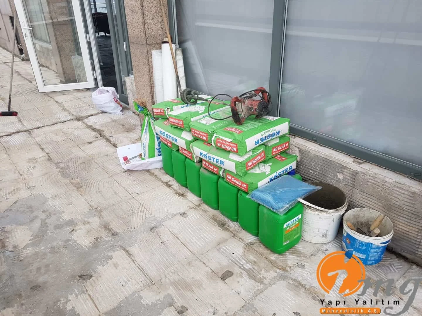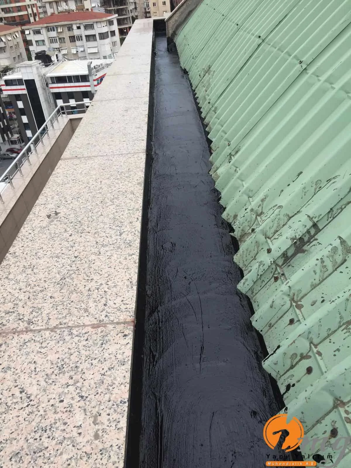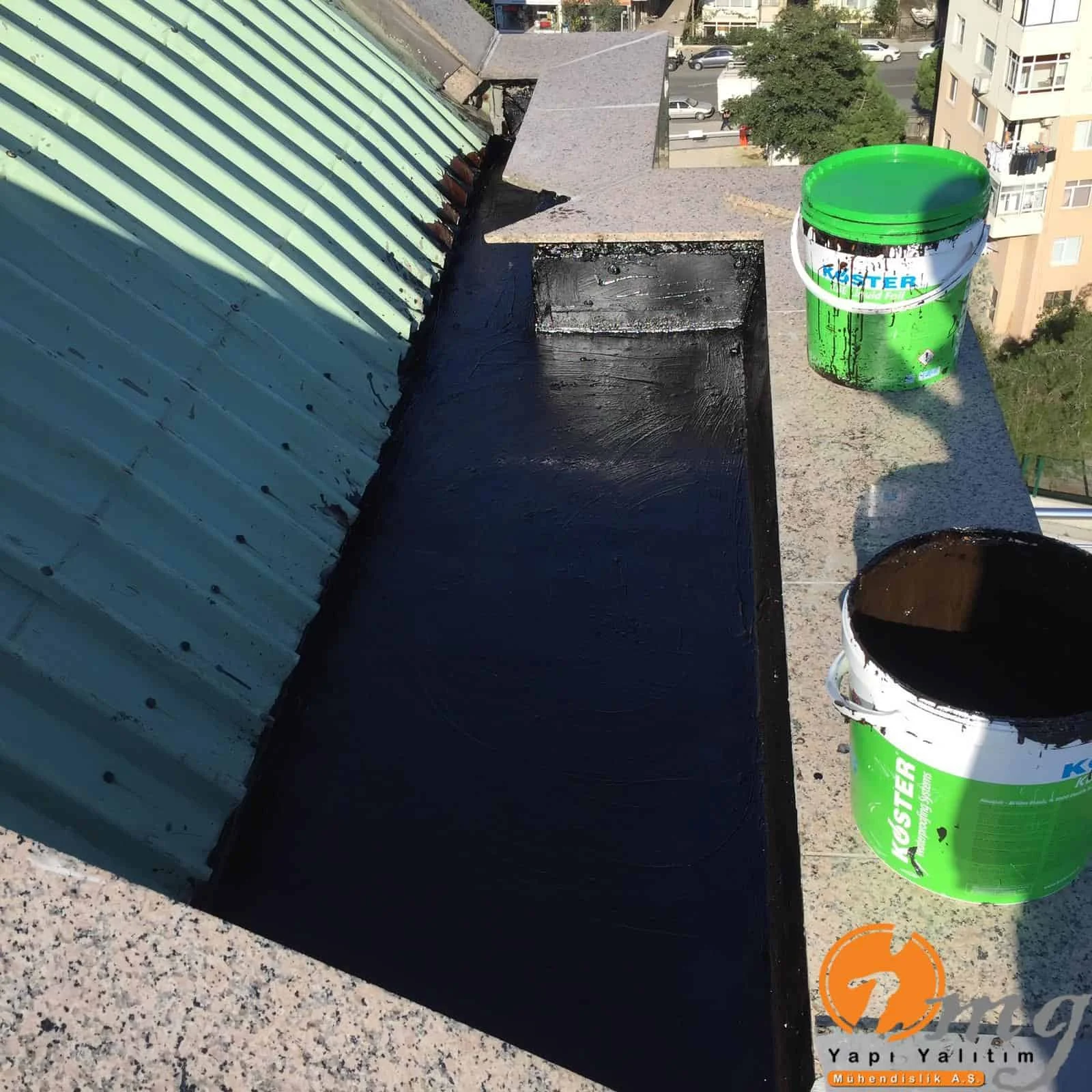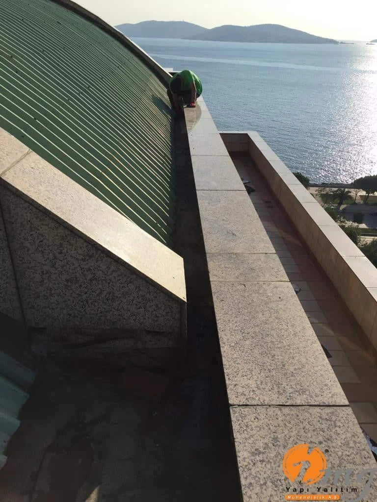 Gizli dere kısımlarında kauçuk bitüm esaslı uv ışınlarına dayanımlı Köster KBE kullanıldı. Teras kısımlarında ise fayanslar kaldırılıp pahlar yapıldıktan sonra tam elastik ıslak hacimlerde kullandığımız Köster Nb Elastik 2K ile 2 kat fileli uygulama yapıldı. Süzgeçler değiştirildi ve dip noktalara mastik çekildi.