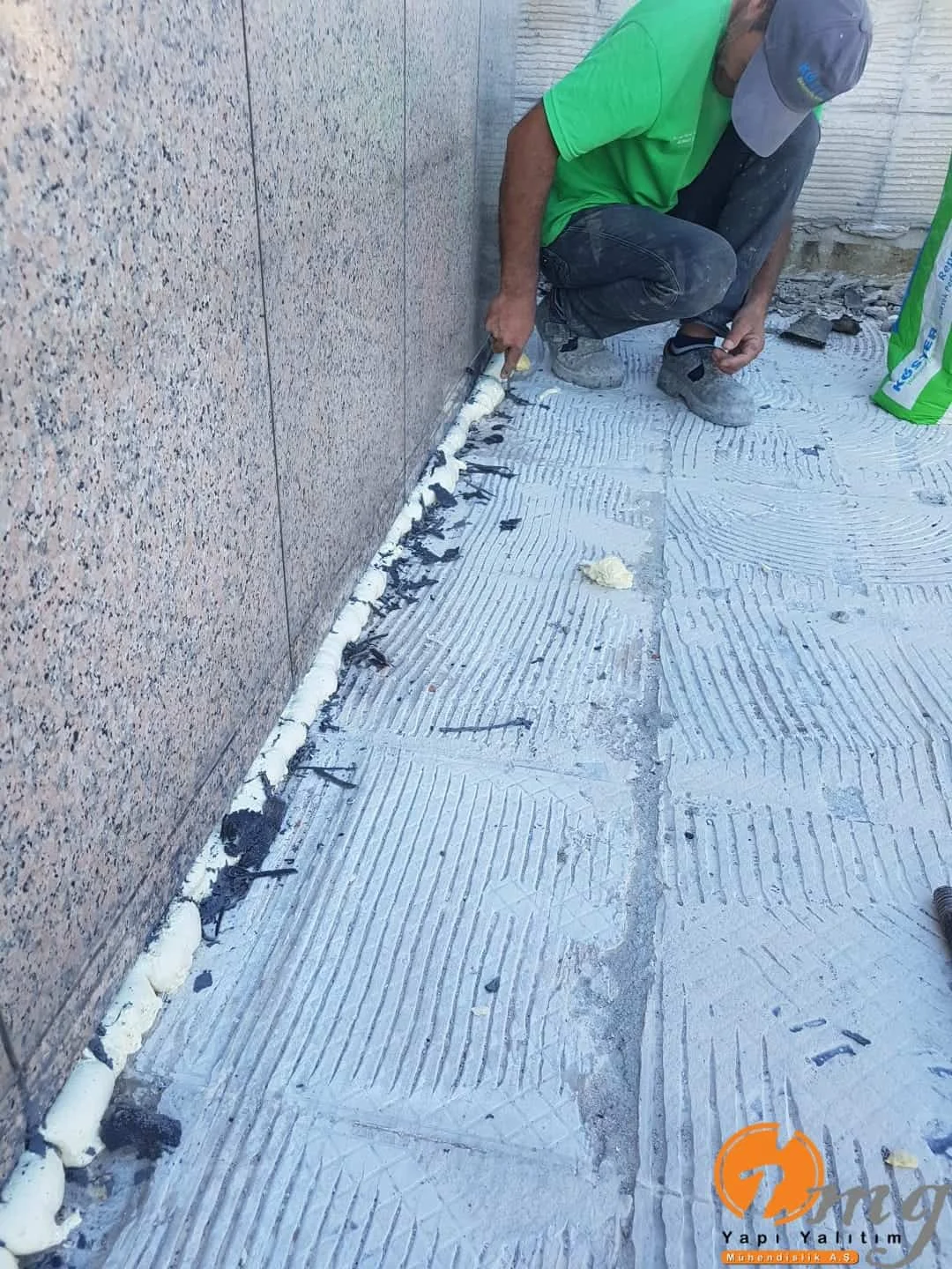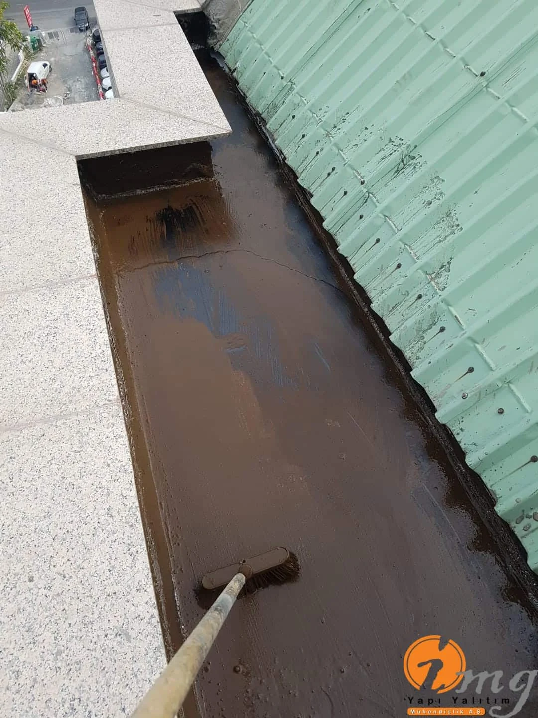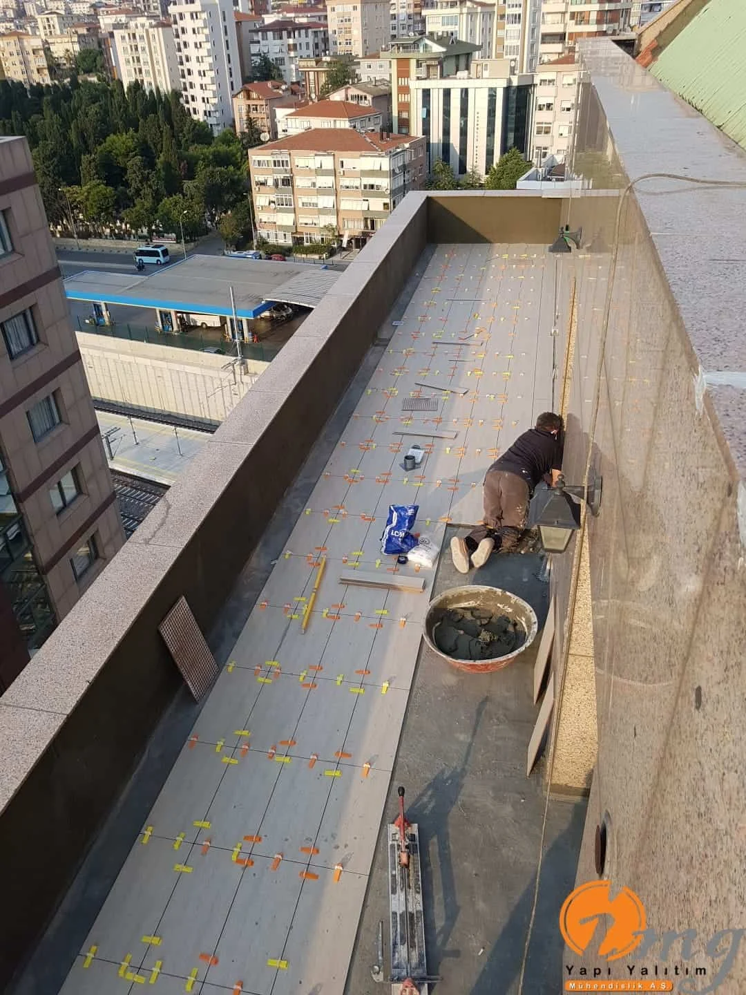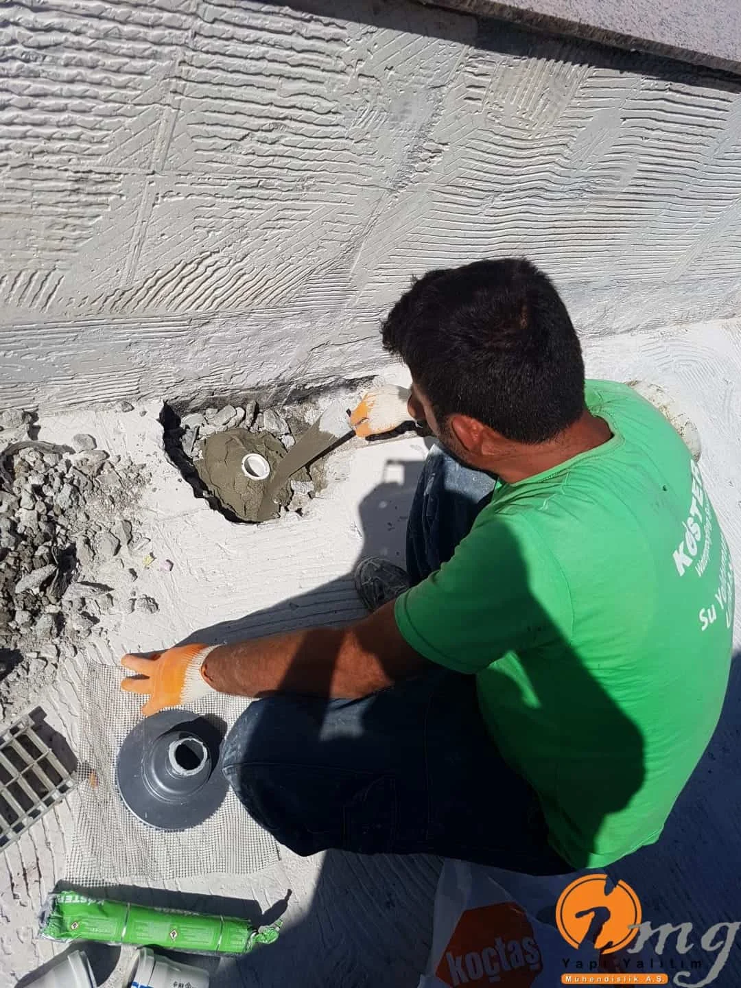 Gizli dere kısımlarında kauçuk bitüm esaslı uv ışınlarına dayanımlı Köster KBE kullanıldı. Teras kısımlarında ise fayanslar kaldırılıp pahlar yapıldıktan sonra tam elastik ıslak hacimlerde kullandığımız Köster Nb Elastik 2K ile 2 kat fileli uygulama yapıldı. Süzgeçler değiştirildi ve dip noktalara mastik çekildi.