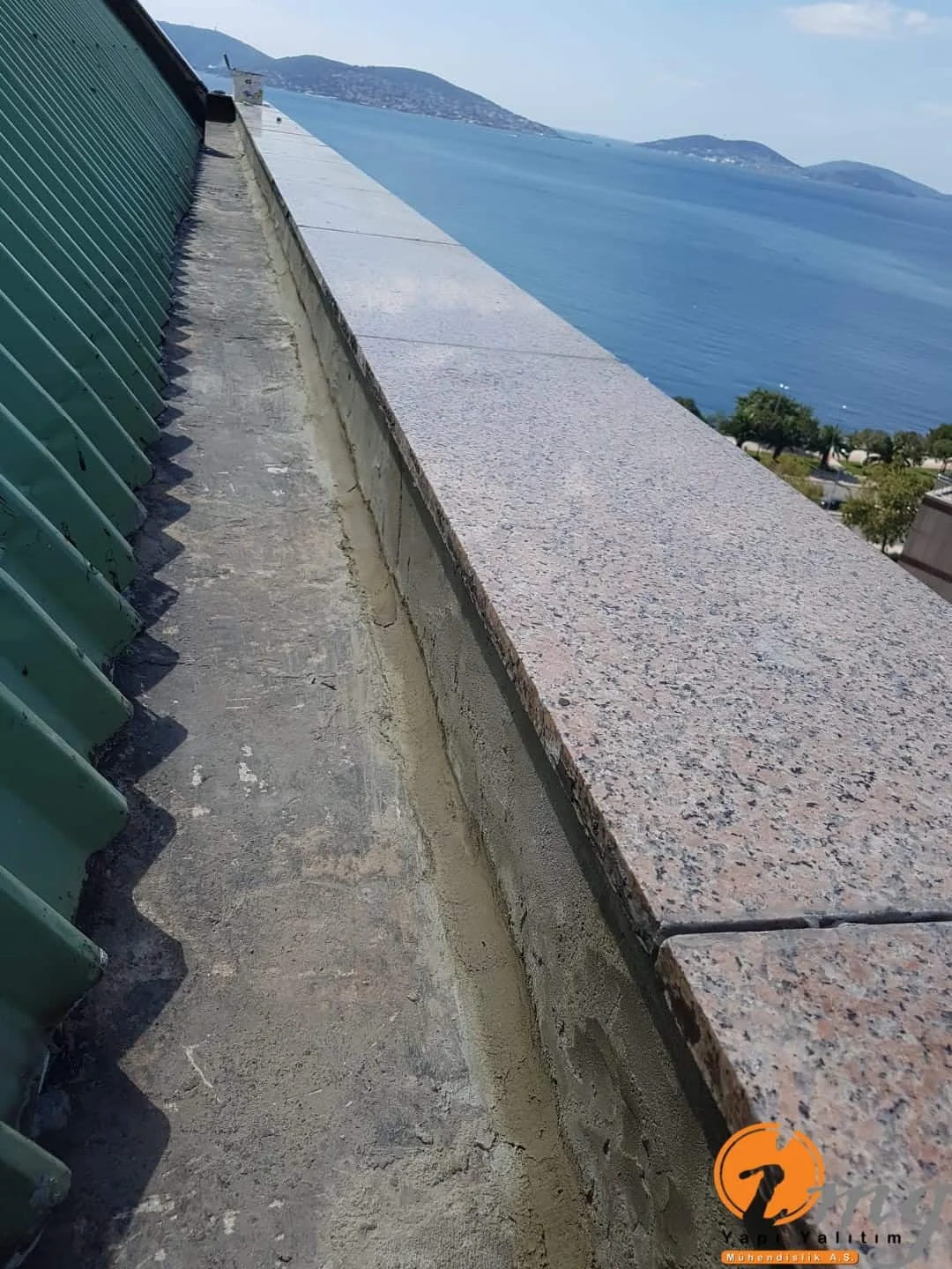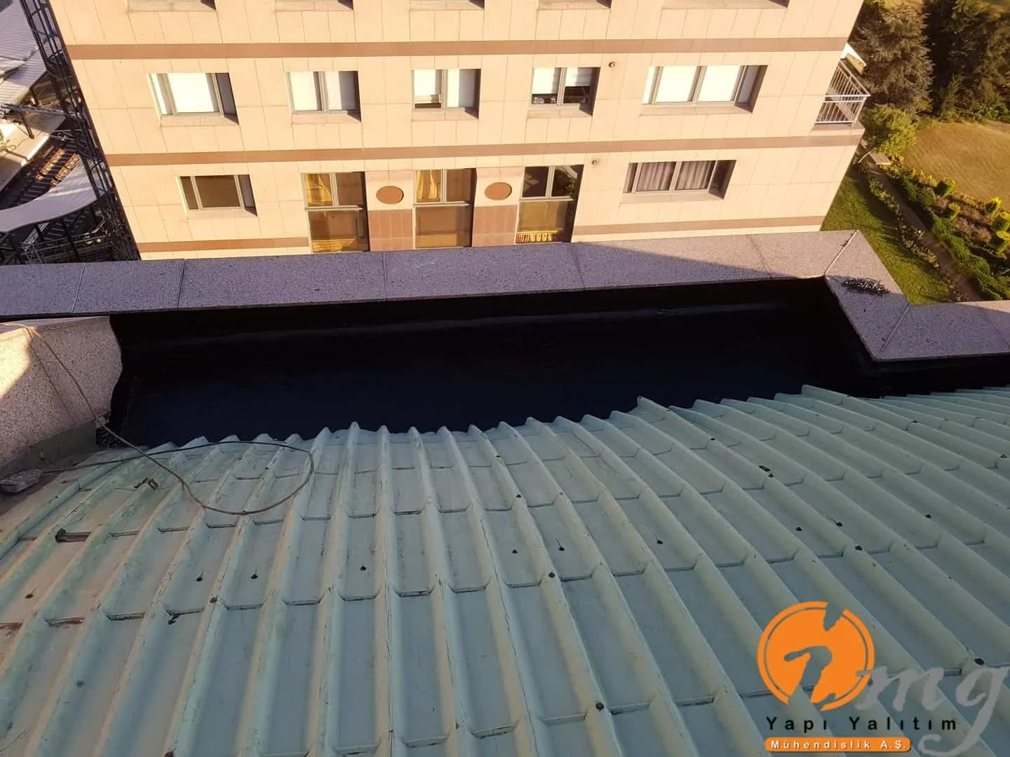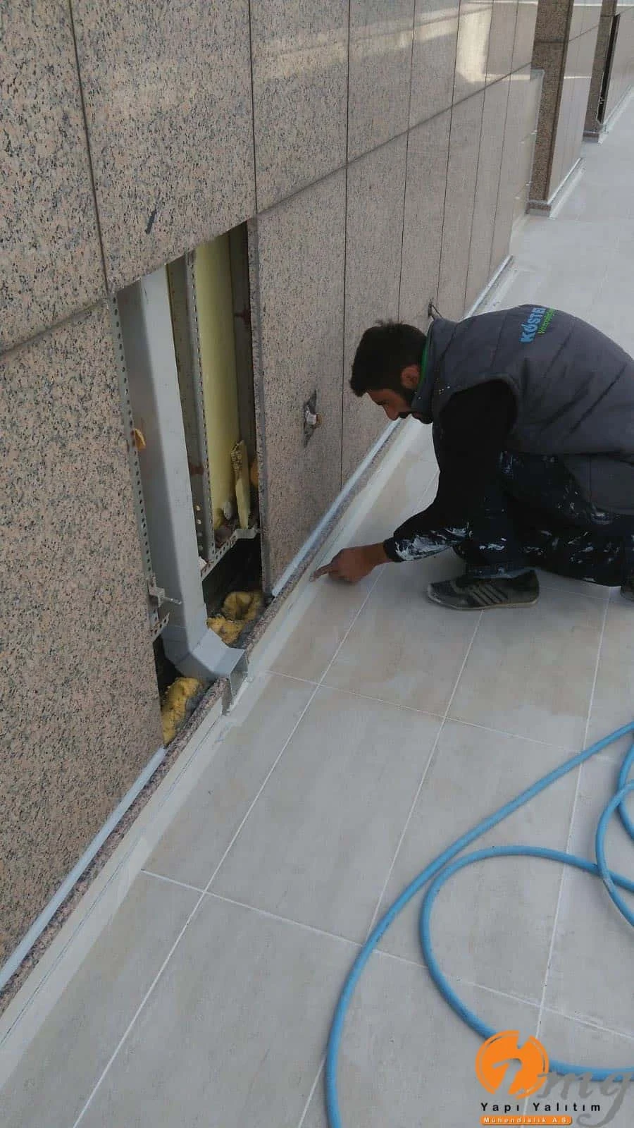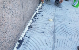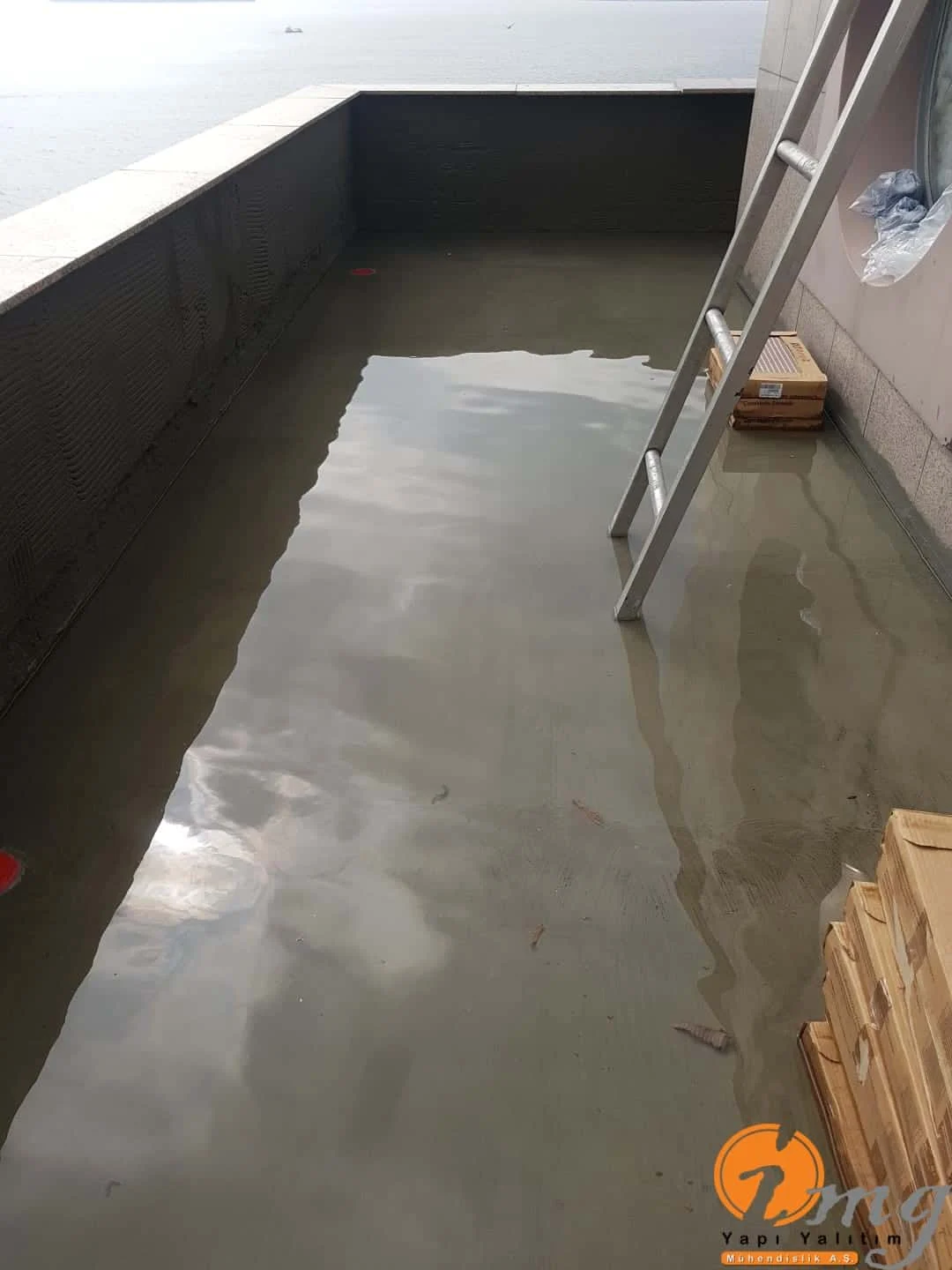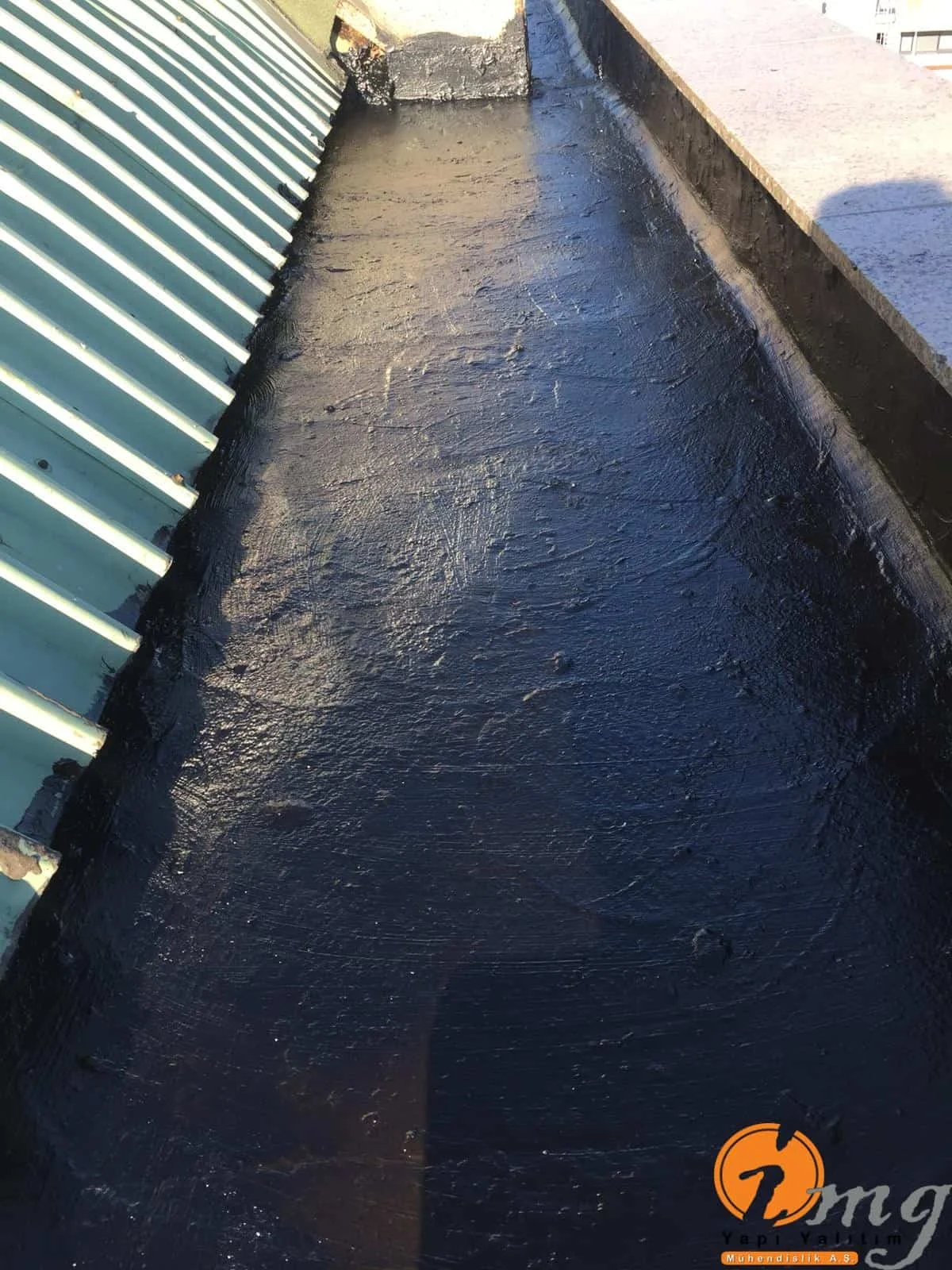 Gizli dere kısımlarında kauçuk bitüm esaslı uv ışınlarına dayanımlı Köster KBE kullanıldı. Teras kısımlarında ise fayanslar kaldırılıp pahlar yapıldıktan sonra tam elastik ıslak hacimlerde kullandığımız Köster Nb Elastik 2K ile 2 kat fileli uygulama yapıldı. Süzgeçler değiştirildi ve dip noktalara mastik çekildi.