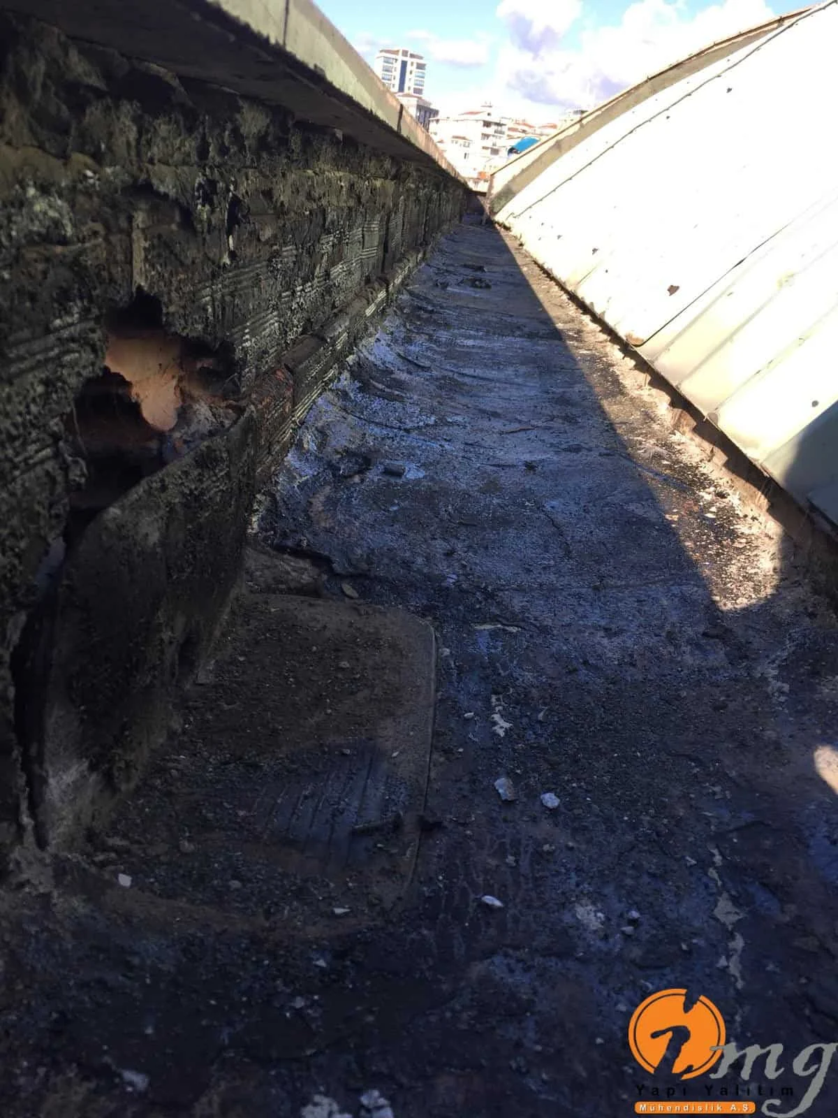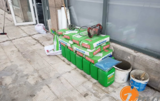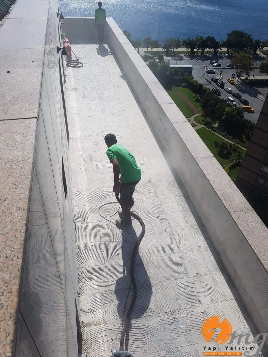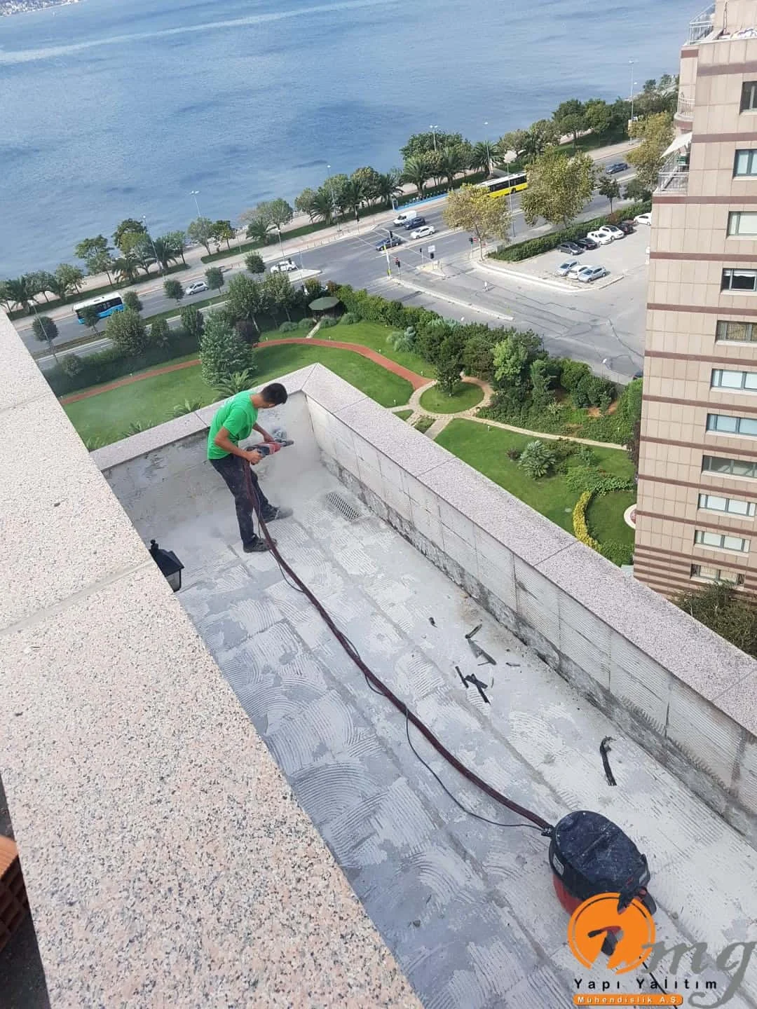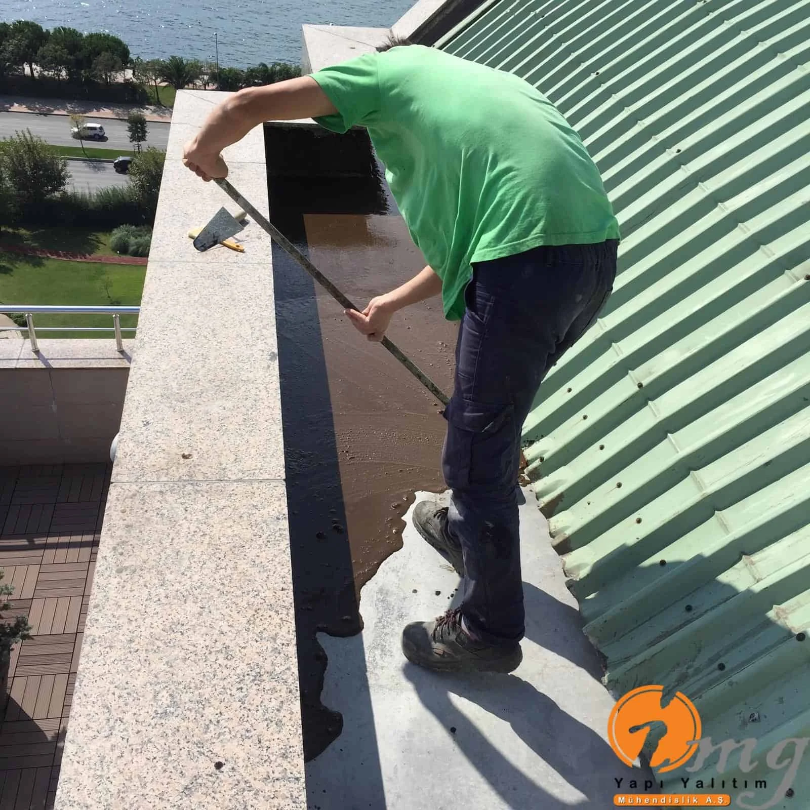 Gizli dere kısımlarında kauçuk bitüm esaslı uv ışınlarına dayanımlı Köster KBE kullanıldı. Teras kısımlarında ise fayanslar kaldırılıp pahlar yapıldıktan sonra tam elastik ıslak hacimlerde kullandığımız Köster Nb Elastik 2K ile 2 kat fileli uygulama yapıldı. Süzgeçler değiştirildi ve dip noktalara mastik çekildi.