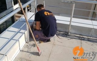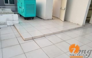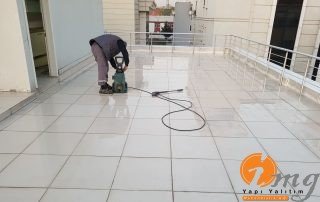 Yıkama işlemi yapıldıktan sonra teras kısmında köşelere poliüretan mastik çekimi yapıldı. Tüm hava şartlarında kullanılabilen Alfa Hibrit serisi ile fayanslar kaldırılmadan su yalıtımı yapıldı.