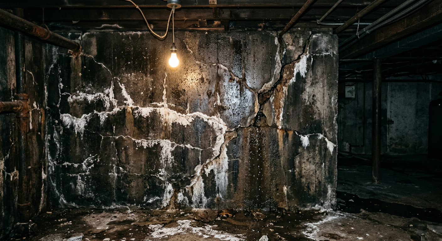 Efloressans (tuz birikimi), aktif su sızıntısı ve beton çatlakları — bodrum katlarda görülen klasik hasar tablosu.